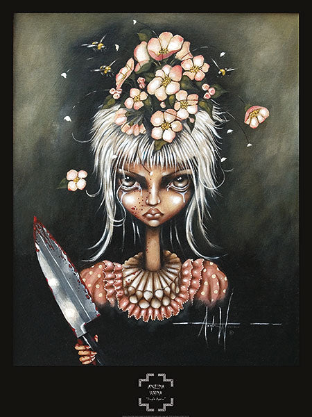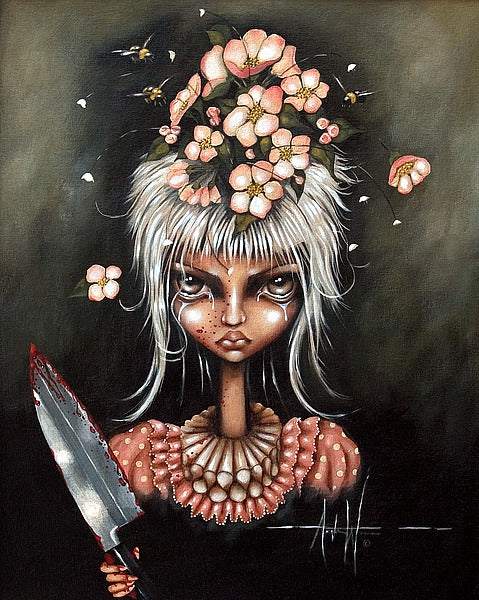 A girl with white hair in a flowery pink dress with pink flowers on her head. Tears stream down her face with specs of blood on it. She holds a bloodied knife. Bees buzz around the flowers.