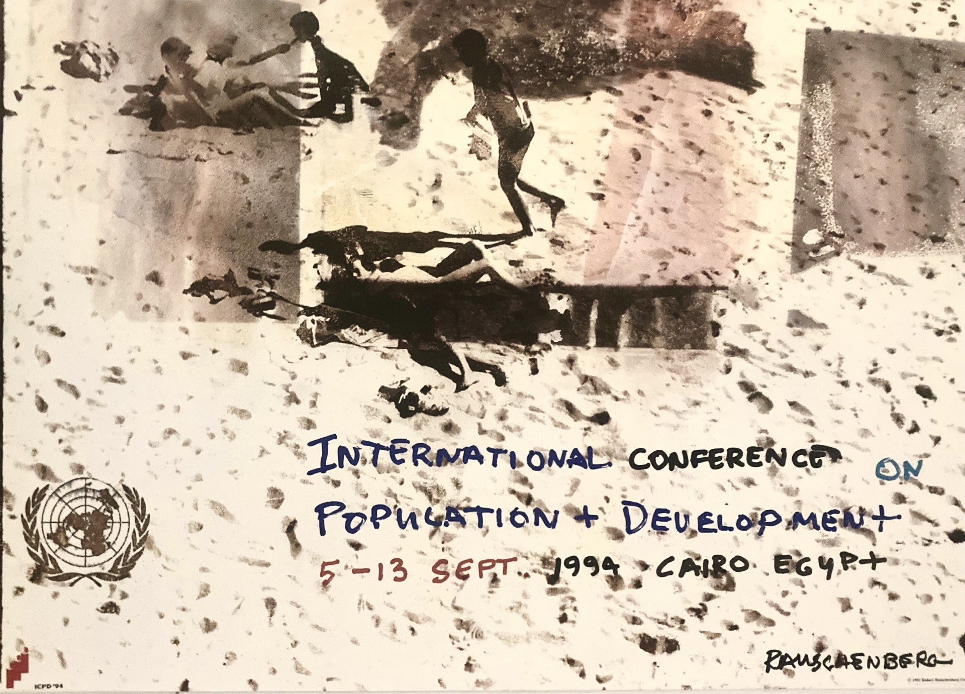 Poster in promotion of the the United Nations World Population Conference held in Cairo, Egypt, 1994. Designed and created by artist Robert Rauschenberg. Features blue, black, red, and gold tones. Depicts a map of the globe with small figures that appear in a painted and sketched design overtop. Signed in print in the bottom right corner.