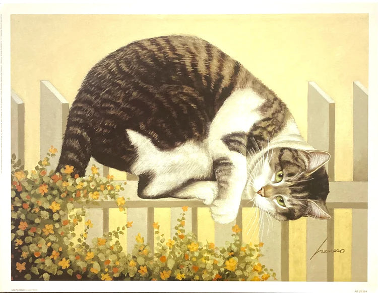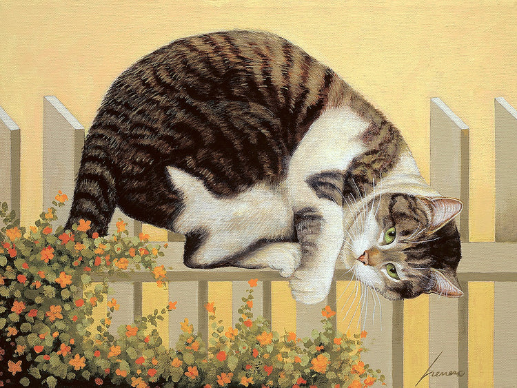 A piece by Lowell Herrero titled "Little Pal Gilbert". Shows a grey and white cat sitting on a fence, above a flower bush.